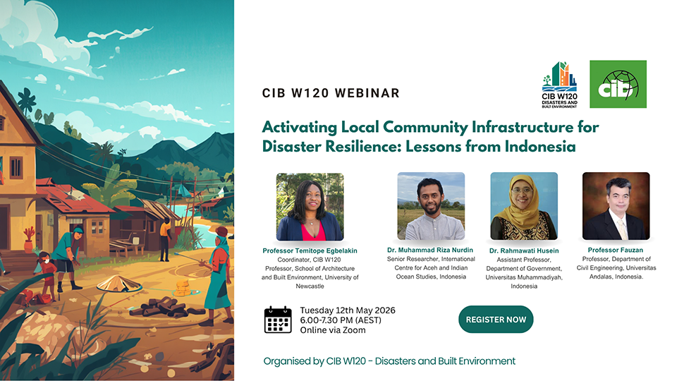 CIB W120 Disasters and the Built Environment will host its next seminar on Tuesday 12th May on Activating Local Community Infrastructure for Disaster Resilience: Lessons from Indonesia.